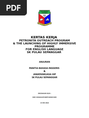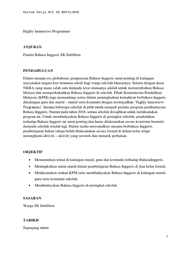 Khalayak perlu membaca kertas kerja tersebut untuk mendapatkan maklumat berkaitan idea yang hendak disampaikan. Kertas kerja karnival nasyid sambutan 20 tahun al furqan tarikh. SEKOLAH KEBANGSAAN NANGA KESIT LUBOK ANTU KERTAS KERJA ASSEMBLY IN ENGLISH HIGHLY IMMERSIVE PROGRAMME HIP SK NANGA KESIT PROJEK PANITIA BAHASA INGGERIS 2016 SEKOLAH KEBANGSAAN NANGA KESIT 95900 LUBOK ANTU DI BAWAH KENDALIAN GURU PANITIA BAHASA INGGERIS 10 PENGENALAN Highly Immersive Programme HIP adalah.